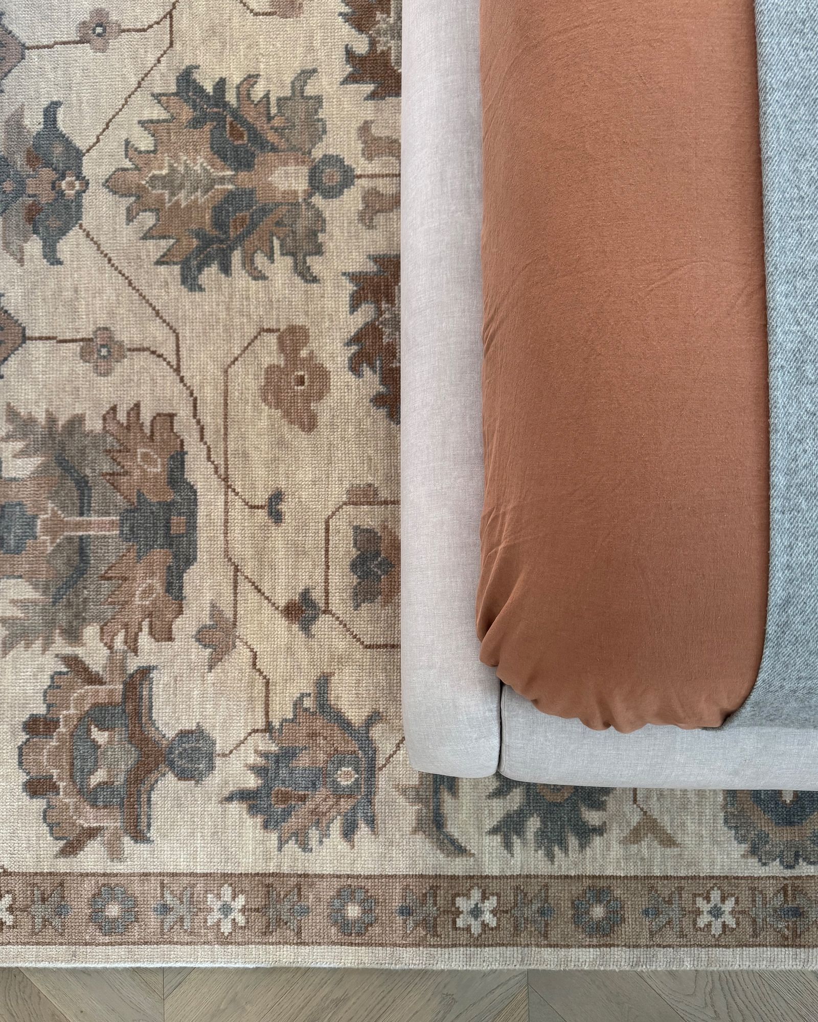 Peony Coast reveals a traditional floral pattern woven in tones of slate blues and greys mingling with mocha with chocolate brown highlights atop a neutral base.