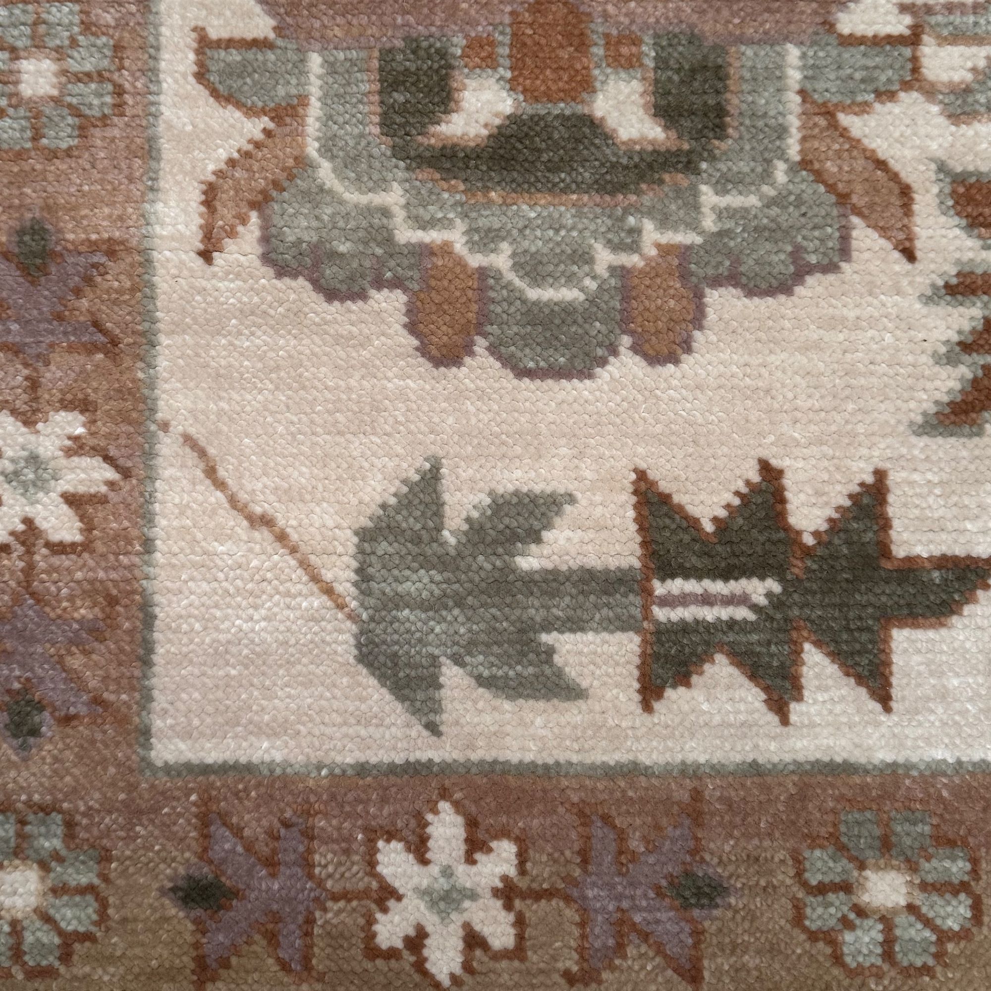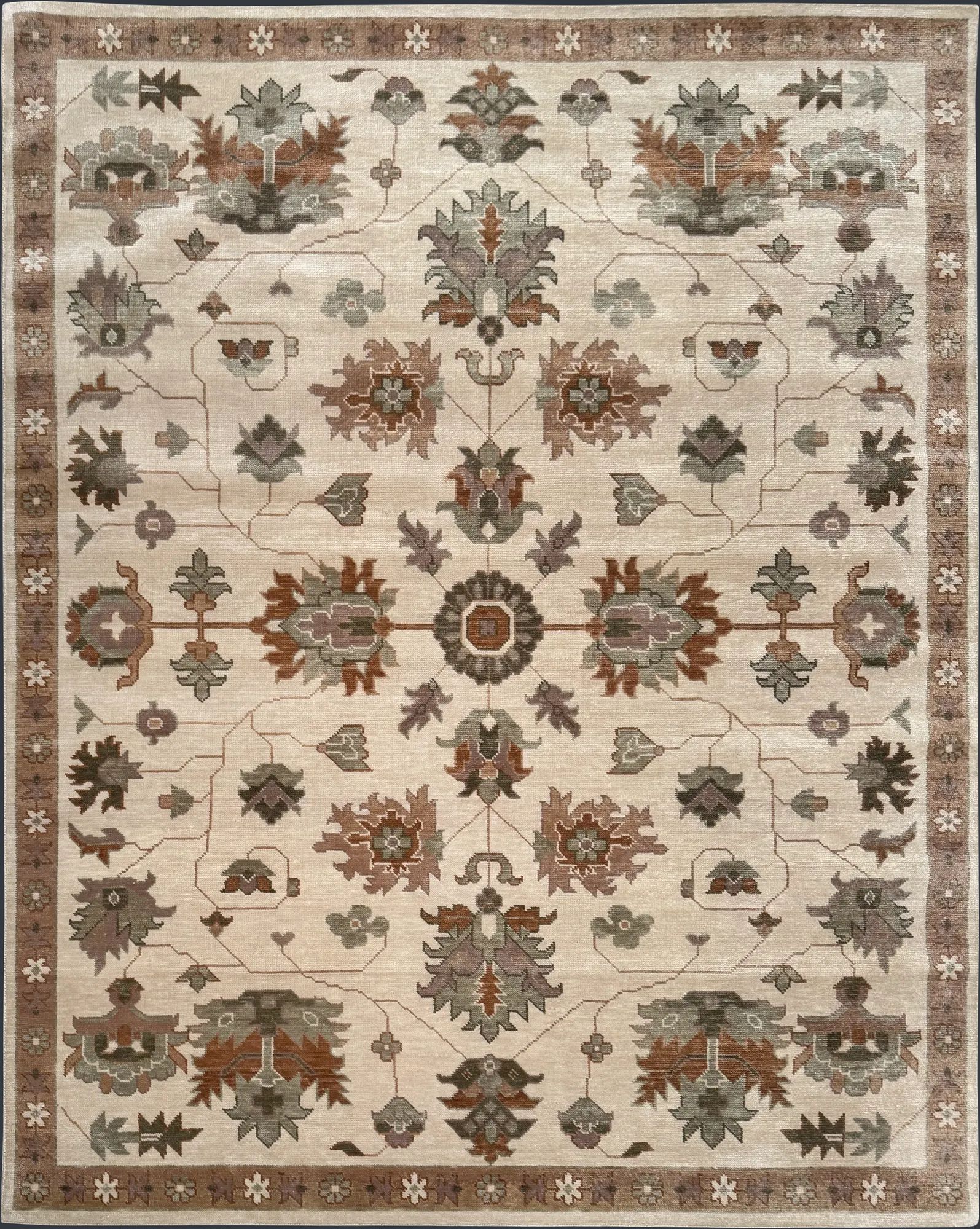 Peony Woods reveals a traditional floral pattern woven in tones of grey green and slate olive with rust highlights atop a warm neutral base.